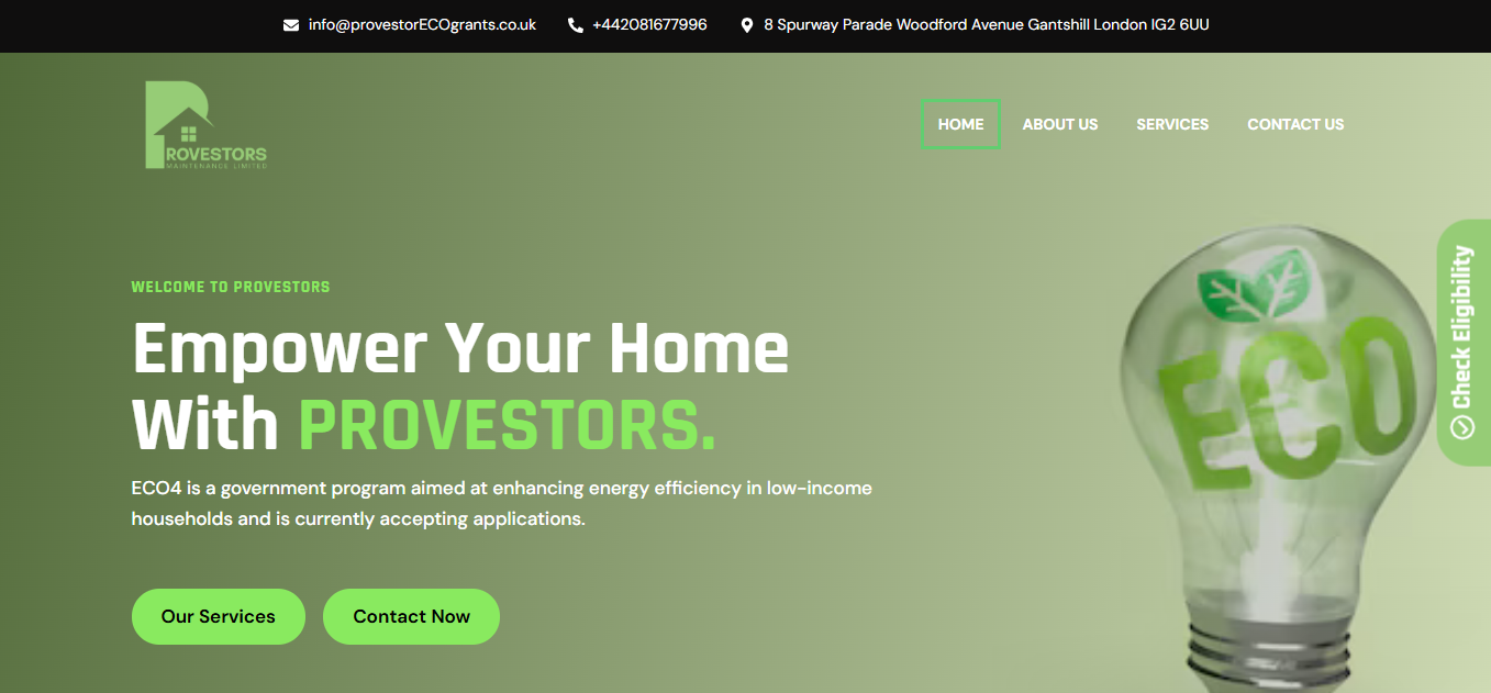 Designed and developed the website for Provestors Energy Solutions, a UK-based company helping homeowners access the ECO4 Grant for improved energy efficiency. The website clearly presents grant details, promotes sustainable living, and guides users through the eligibility and application process.